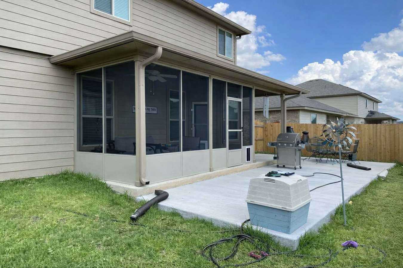 Most screen room installations take two to four days. Workers stay outside your home throughout the build. After the city inspector signs off, you can move furniture in the same day. We walk you through the finished room before we close out the job.